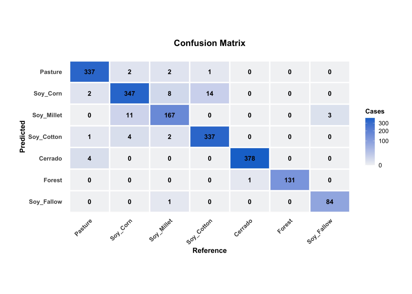 Cross-validation measures how well the model fits the training data. Using these results to measure classification accuracy is only valid if the training data is a good sample of the entire dataset. Training data is subject to various sources of bias. In land classification, some classes are much more frequent than others, so the training dataset will be imbalanced. Regional differences in soil and climate conditions for large areas will lead the same classes to have different spectral responses. Field analysts may be restricted to places they have access (e.g., along roads) when collecting samples. An additional problem is mixed pixels. Expert interpreters select samples that stand out in fieldwork or reference images. Border pixels are unlikely to be chosen as part of the training data. For all these reasons, cross-validation results do not measure classification accuracy.
